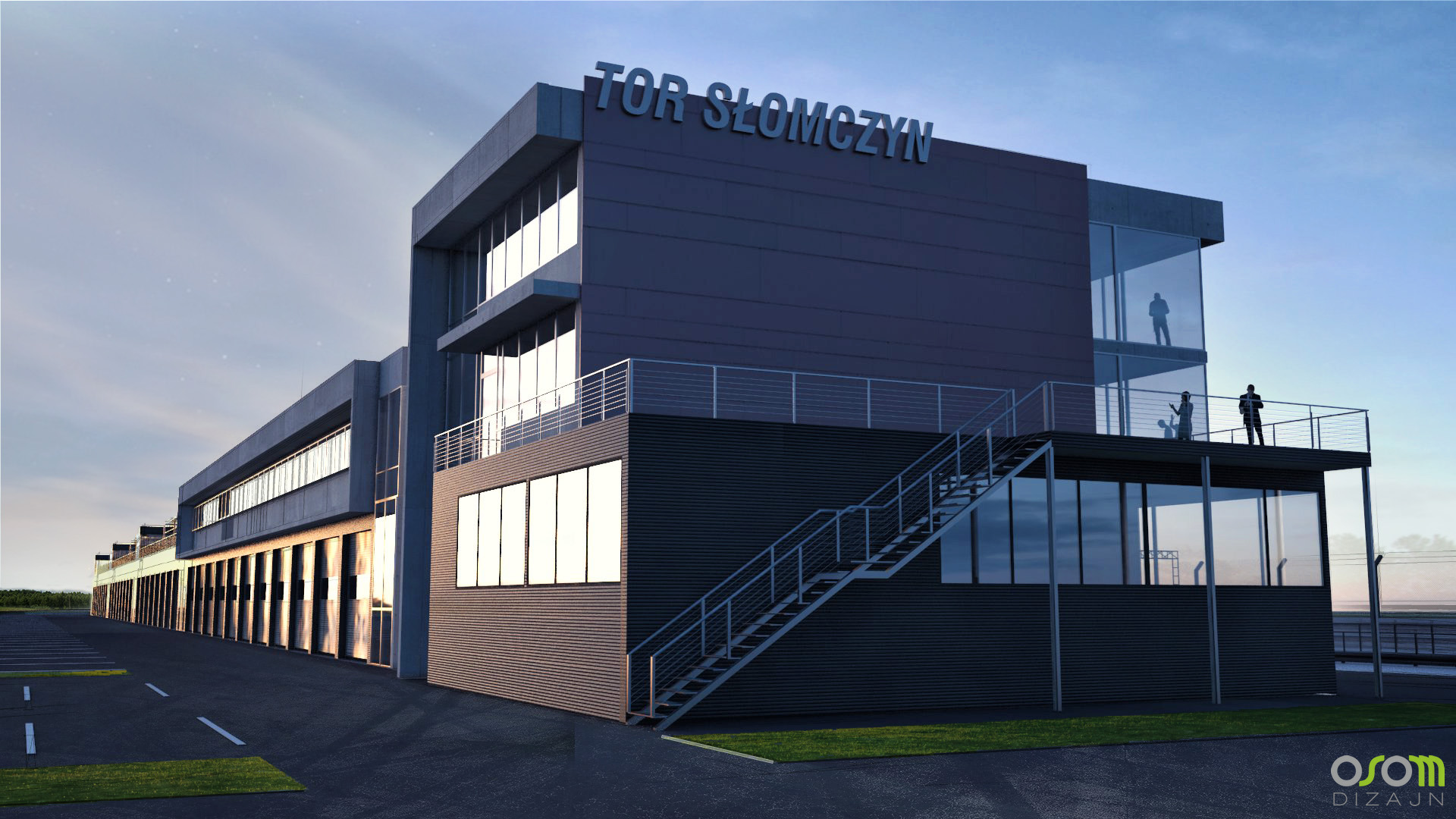 Projekt budynku kontroli wyścigów, budynku administracyjno - szkoleniowego ze strefą VIP oraz zapleczem gastronomicznym z garażami w parterze. Budynek został zaprojektowany dla koncepcji rozbudowy toru kartingowego Słomczyn koło Grójca o tor wyścigowy. /we współpracy z HiM Grupa Projektowa/