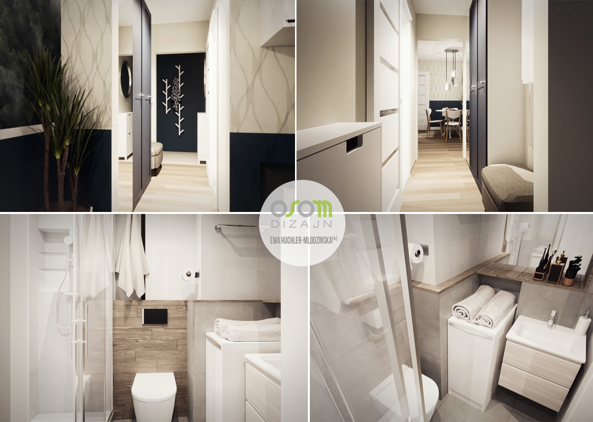 Mieszkanie w budynku z wielkiej płyty na osiedlu Dąbrowa w Łodzi. Szczególne wyzwanie stanowiło zaprojektowanie niewielkiej łazienki, która oryginalnie wyposażona była tylko w niewielką wannę i miskę WC. Z racji małego metrażu mieszkania i braku pomieszczeń pomocniczych, również malutkiej kuchni, oprócz brakującej umywalki łazienka musiała pomieścić także pralkę.